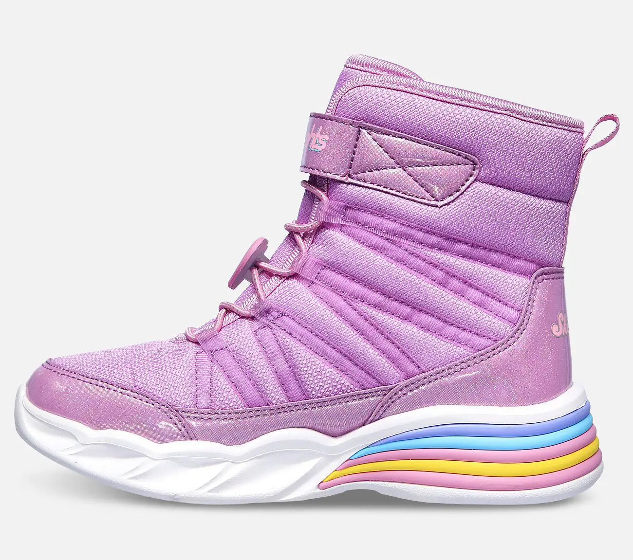 Skechers Sweetheart Ligths – Love To Shine -talvisaappaiden pohjassa on loistavia sydämiä. Sydämet syttyvät, kun saappailla kävellään. Valo sammutetaan kantapäässä olevan napin avulla. Saapas on helppo pukea jalkaan kuminauhan ja tarrakiinnityksen