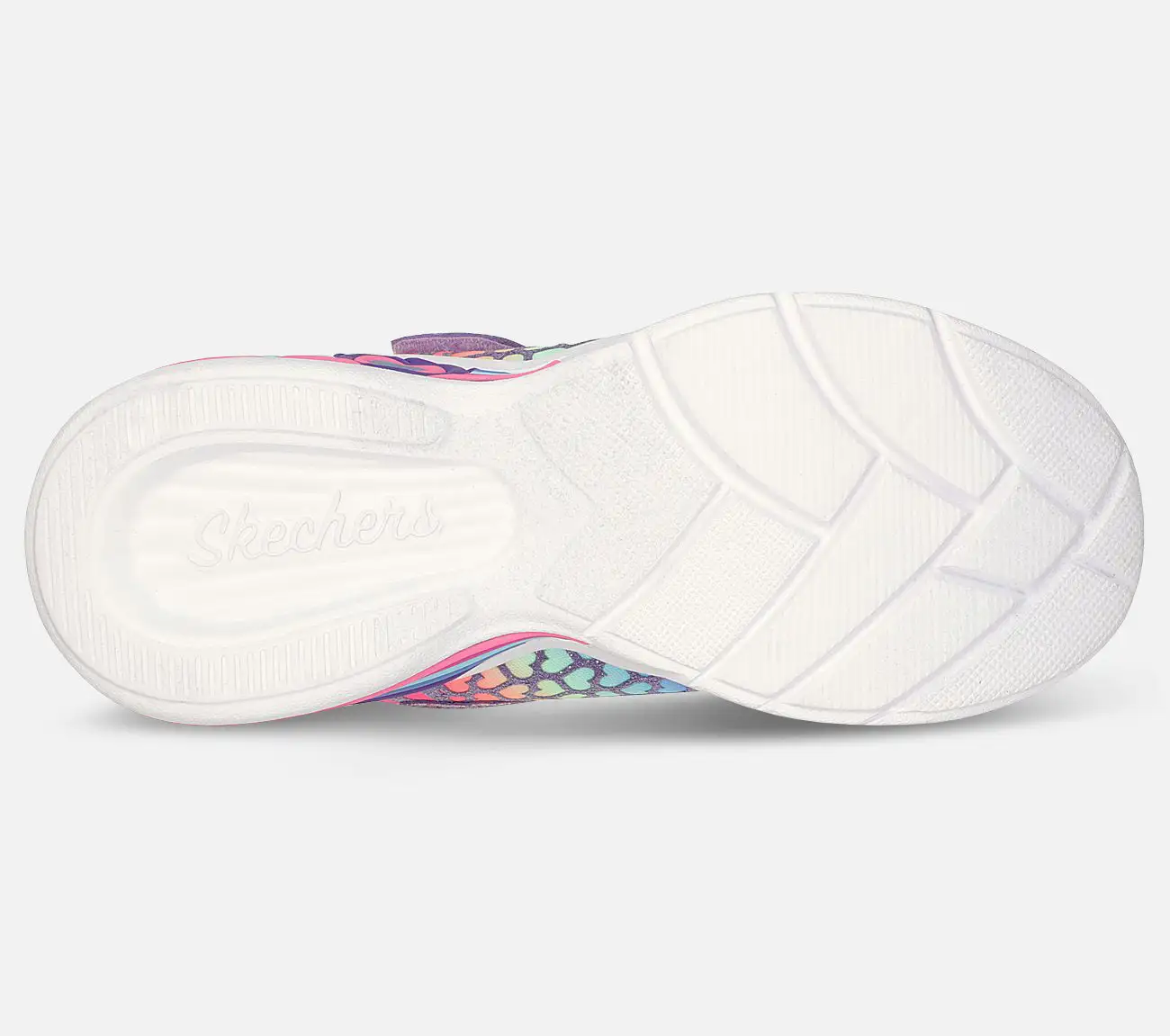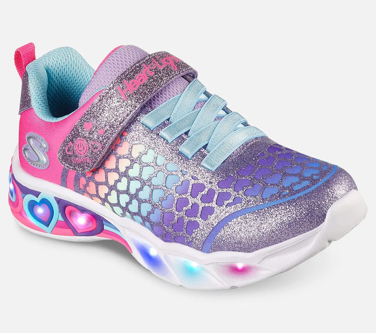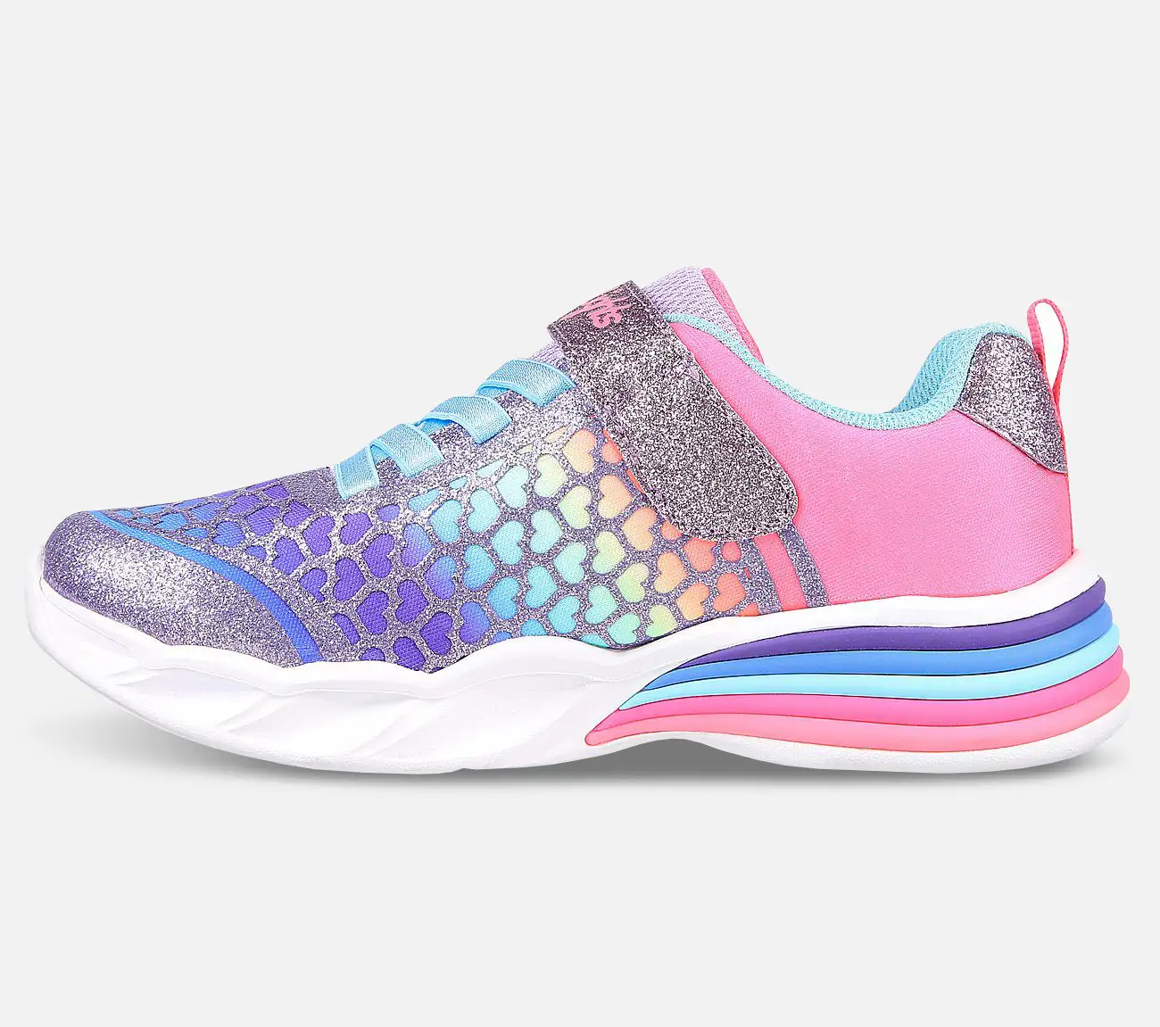 Skechers Heart Lights Sweetheart Light – Lovely Colors on värikäs kenkä, jonka pohjassa on vilkkuvat valot. Sateenkaaren värit piristävät taatusti. Sateenkaaren värein varustellussa päällisosassa on glitteriä ja sydämiä. Pohja vilkkuu eri väreissä, kun lapsi kävelee. Tarranauhakiinnityksen ja joustavan kuminauhan ansiosta kenkä on helppo laittaa jalkaan. Valot voidaan sammuttaa tarranauhasta.